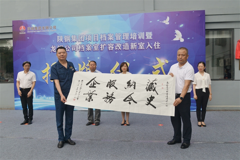 項目施工方陜西金銀島建筑工程有限公司贈予龍鋼公司檔案室 “藏史納今,服務(wù)企業(yè)”的題字。