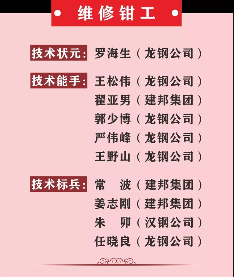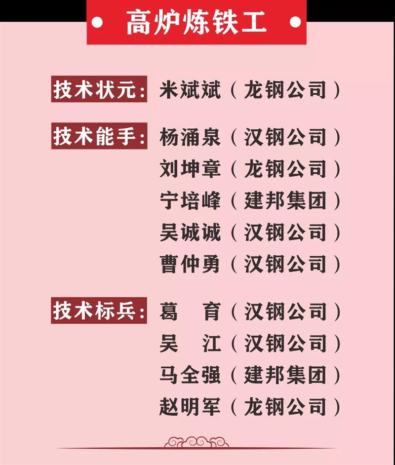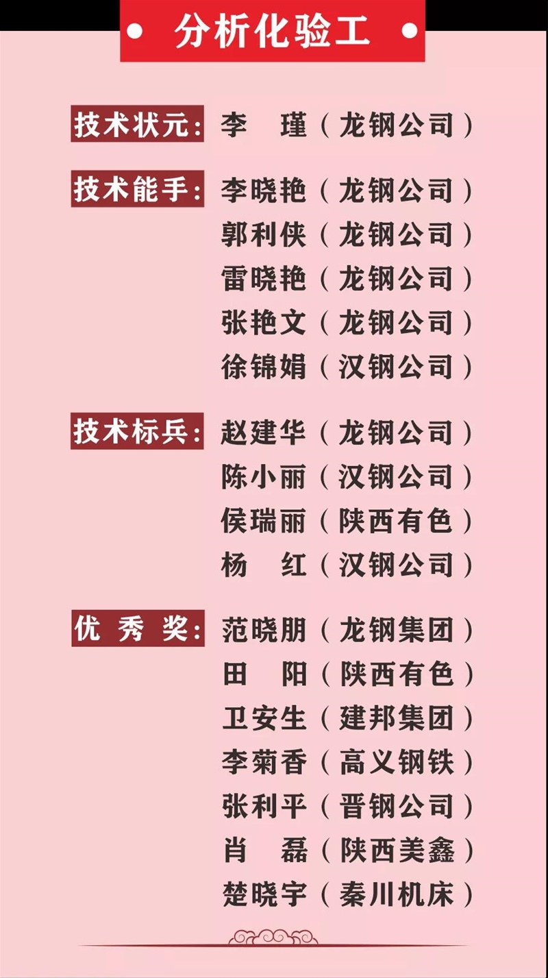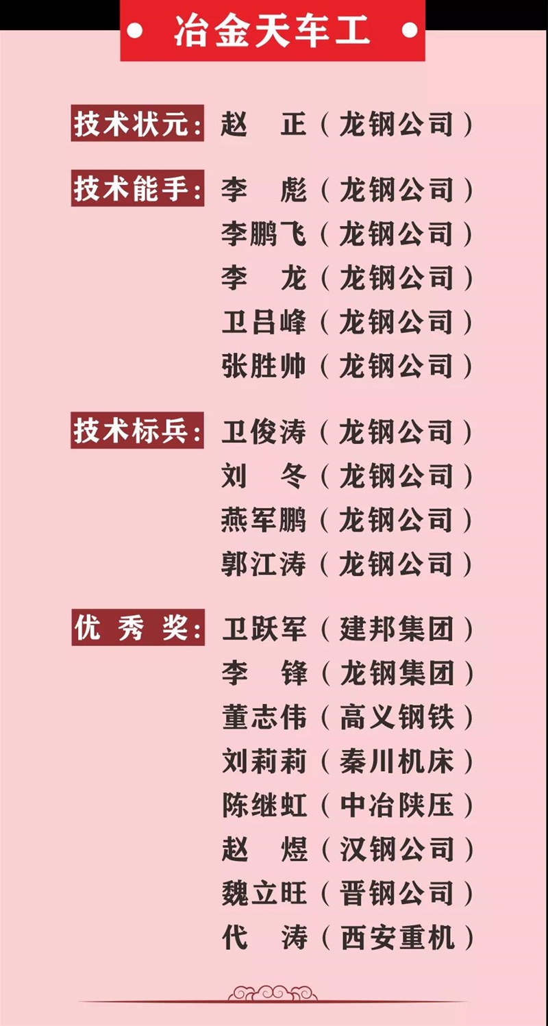 薛繼虎宣布表彰決定。本次競賽,來自陜西省機械冶金建材系統(tǒng)11家參賽單位以及西北聯(lián)鋼3家山西鋼鐵企業(yè)的137名參賽選手,經(jīng)過3天的激烈角逐,最終在高爐煉鐵工、冶金天車工、分析化驗工、維修鉗工4個工種競賽中產(chǎn)生了陜西省機冶建材系統(tǒng)“技術狀元”4名、“技術能手”20名、 “技術標兵”16名,其中分析化驗工和冶金天車工兩個工種競賽還產(chǎn)生了“優(yōu)秀獎”15名,并在閉幕式進行表彰頒獎,還表彰了優(yōu)秀組織單位和優(yōu)秀組織個人。對獲得本次大賽高爐煉鐵工、冶金天車工前3名的選手將由組委會推薦省有關單位授予“陜西省技術能手”稱號。