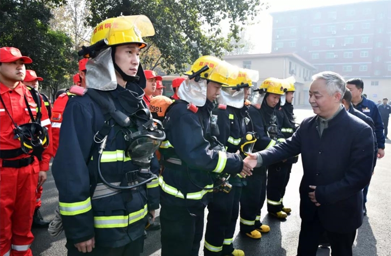 楊海峰在慰問中與龍鋼公司煤氣救護隊和消防隊隊員一一握手,并現(xiàn)場觀摩了消防隊消防車現(xiàn)場實操演示、煤氣救護隊空氣呼吸器操作和應(yīng)急隊員心肺復(fù)蘇模擬演示。