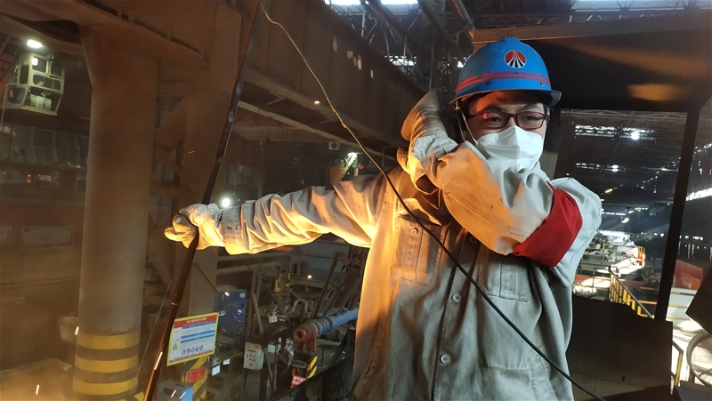 在1#連鑄機大包平臺上,丁班大包工孫建鵬正在測中包溫度。只見他一手擋著臉一手拿測溫槍,吱吱吱,顯示器上顯示1535攝氏度,他拿起自開表認(rèn)真登記著鋼水溫度,測試大包斷電關(guān)包情況,并認(rèn)真檢查大包三聯(lián)滑系統(tǒng)運行情況。不一會兒,大包澆完后,他立即用力轉(zhuǎn)動大包機械手臂的操作手柄,卸下大包套管后,又開始戴油缸、戴套管……一系列動作迅速、嫻熟。火紅的鋼水炙烤著他黝黑的臉龐,藍(lán)色安全帽下他的眼神更加堅毅。