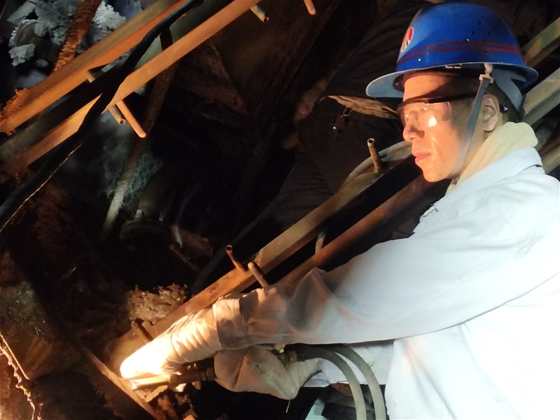 在4#連鑄機二冷室里,第堅強正埋頭忙碌著,尾坯剛剛拉過二冷室,等不及溫度降下來,他拿著扳手、割槍,鉆進(jìn)狹小的二冷室里干活,噴淋管上不時有水滴落下,他在水滴與汗滴下與時間賽跑。從一流到八流,從一段到三段,“滋滋”的聲響伴隨著鋼花飛舞。這一進(jìn)去便是半小時,等他出來后,全身的工作服都濕透了,汗水順著衣角流到了地上,而他全然不顧,又忙著去切冷鋼。
