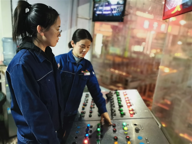 推鋼工們雖然年齡不一、性格各異,但她們都有一個(gè)共同的特征,那就是不怕苦、不服輸。推鋼崗位就像大浪淘沙,最開(kāi)始時(shí),許多分配到推鋼崗位的女工都受不了高溫環(huán)境和高強(qiáng)度的工作,紛紛調(diào)離,但是這些推鋼工卻在大浪中乘風(fēng)破浪,戰(zhàn)勝種種困難,始終堅(jiān)守在火熱的崗位。她們不僅要正確操作推鋼機(jī)、撈鋼機(jī)、輥道以及熱送設(shè)備,還要高度警惕推鋼機(jī)掉道、鋼坯不切割等異常情況。她們用女性特有的專(zhuān)心、細(xì)心、責(zé)任心,撐起了連鑄安全生產(chǎn)的“半邊天”。