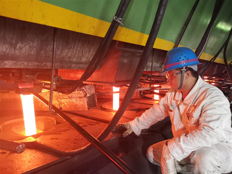 奔涌的鋼水、飛濺的鋼花、炙熱的紅坯……在連鑄生產(chǎn)車間的角角落落,無不體現(xiàn)著熱烈、奮進(jìn)的激情。春末夏初之際,連鑄生產(chǎn)一線溫度持續(xù)攀升,煉鋼人熱情高漲,他們與鋼水為伍、與高溫相伴,為實(shí)現(xiàn)“雙目標(biāo)”,堅(jiān)決打贏“三大翻身仗”全力以赴。看,滾滾的鋼水前,他們一次次測(cè)量著鋼水溫度;飛濺的鋼花中,他們相互協(xié)作更換中包套管;火熱的紅坯旁,他們守護(hù)著“火龍”前進(jìn);緊張的檢修中,他們一秒也不敢耽擱……測(cè)溫、排渣、澆鋼、換水口、切割紅坯……這些看似簡(jiǎn)單的工作,其實(shí)需要頑強(qiáng)的毅力和過硬的操作技能才能完成。煉鋼、練人、煉魂,盡管工作艱苦,但是他們沒有一人喊苦叫累,對(duì)于每一項(xiàng)工作,他們都全力以赴,在煉鋼中冶煉非凡的鋼鐵人生。