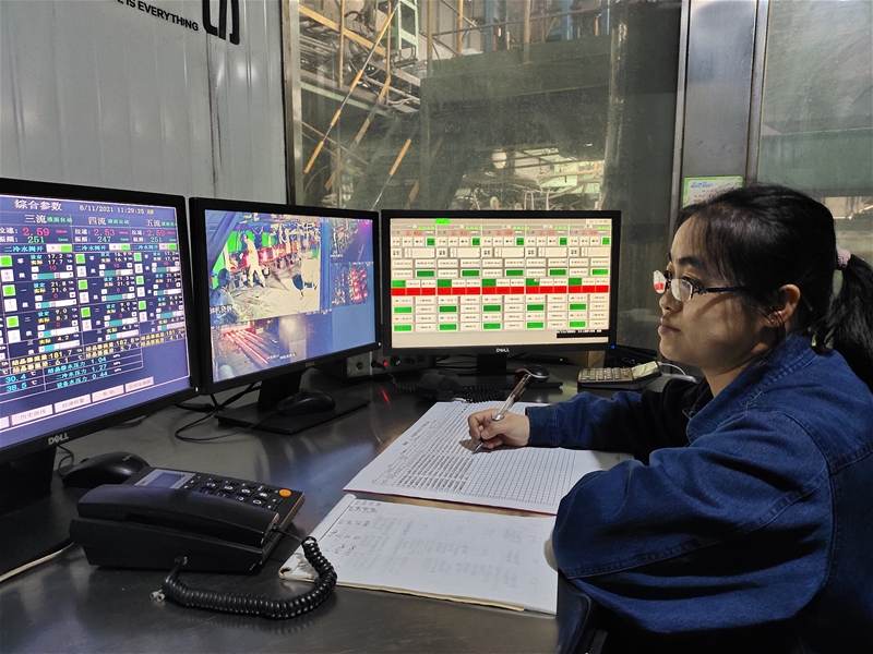 主控工陳小育一只手拿著訊響器播報(bào)中包溫度,另一只手正在認(rèn)真書寫中包溫度。五分鐘一次的播報(bào)溫度,十分鐘一次的記錄書寫,她就這樣一直忙碌著。推鋼工吉銳琴站在操作臺(tái)前,一會(huì)兒抬頭看看顯示器,一會(huì)兒看看臺(tái)下運(yùn)行的鑄坯,手指在按鈕上不停地“舞蹈”??雌饋?lái),似乎主控工和推鋼工的工作都很輕松、簡(jiǎn)單。實(shí)則不然,這完全考驗(yàn)她們的反應(yīng)速度、眼力、手力、心理承受能力等。她們堅(jiān)持將簡(jiǎn)單的事情重復(fù)做,重復(fù)的事情用心做,無(wú)怨無(wú)悔,用瘦弱的身體挑起了生產(chǎn)的重?fù)?dān),用實(shí)際行動(dòng)詮釋著巾幗擔(dān)當(dāng)。