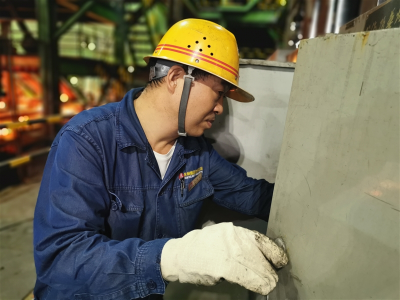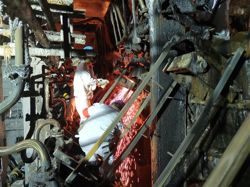 剛剛停機(jī)的現(xiàn)場,被熱浪團(tuán)團(tuán)包裹,像極了一個巨型蒸籠。檢修時間只有兩小時,這對他們來說,無疑是一個挑戰(zhàn),大家等不及設(shè)備溫度降下來,就迫不及待地來到各自負(fù)責(zé)區(qū)域,一瞬間,澆鋼區(qū)、二冷室、拉矯機(jī)、輥道旁……人頭攢動、熱鬧非凡。二冷室內(nèi)潮濕悶熱,作業(yè)環(huán)境復(fù)雜,讓人呼吸都變得困難,幾名身穿白色阻燃服的中包工,順著噴淋管爬上爬下,他們腳踩在細(xì)細(xì)的支架上。這群“蜘蛛俠”在縱橫交錯的管道間,隨意調(diào)整著身體,有的仔細(xì)清理噴咀,有的認(rèn)真切割冷鋼,這看起來困難重重的工作,他們卻游刃有余。不一會,他們厚厚的工作服被汗水浸濕,臉上的汗水也在大負(fù)荷照明燈下泛著亮光??杀M管如此,他們的目光始終盯在設(shè)備上,沒有半分懈怠。