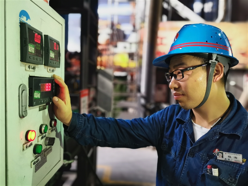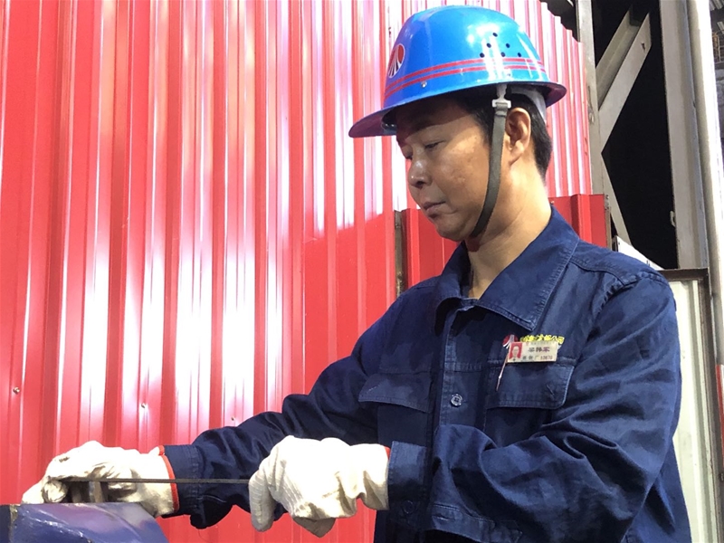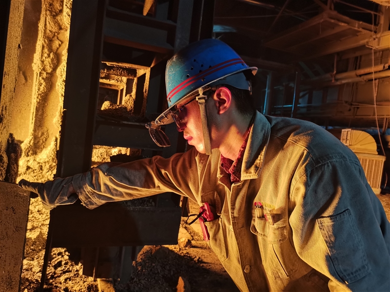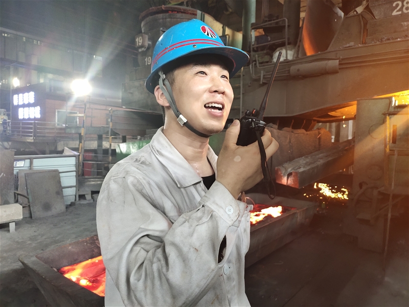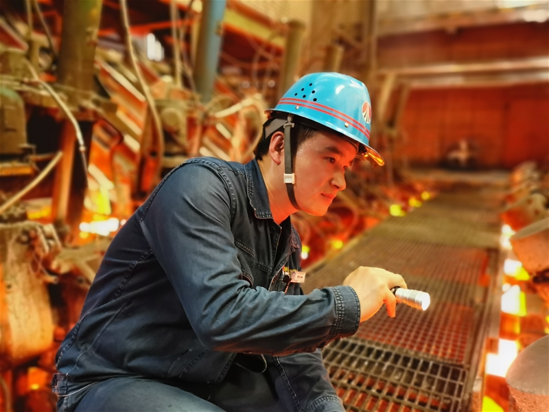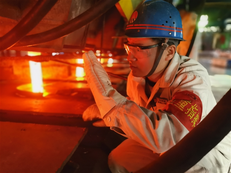 圖八:煉鋼廠連二作業(yè)區(qū)6#連鑄機(jī)中包工何武濤正在對在線水口、機(jī)件進(jìn)行檢查。面對眼前1500℃的鋼水,他眼戴護(hù)目鏡,身穿阻燃服,在汗流浹背中守護(hù)著安全生產(chǎn)。