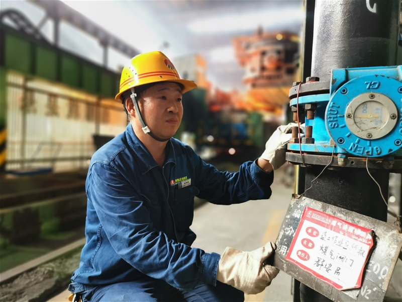 圖三:煉鋼廠連二作業(yè)區(qū)安全員張保銀正在檢查煤氣設(shè)備,現(xiàn)場的溫度持續(xù)攀升,汗珠順著他的臉頰滾落,但是他始終牢記自己的職責(zé)與使命,不放過任何一個細(xì)節(jié),用實(shí) 際行動踐行著自己的安全誓言。