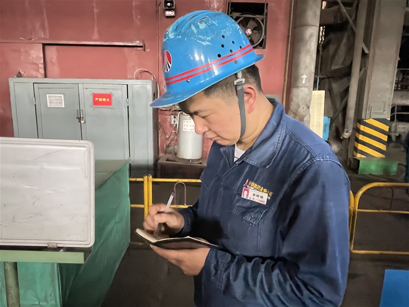圖九:煉鋼廠天車作業(yè)區(qū)天車工李鋒博在記錄設(shè)備運(yùn)行情況,他所在的出坯垮地面全是1000℃的紅坯,熱量持續(xù)往上方擴(kuò)散,臉上的汗珠往下滑落,不變的是他對設(shè)備的認(rèn)真負(fù)責(zé)。