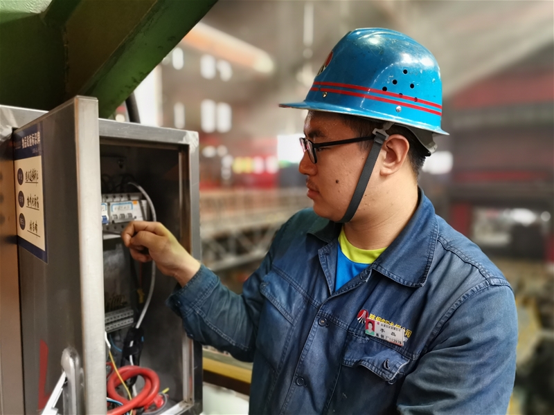 圖四:煉鋼廠轉(zhuǎn)爐平臺上電儀作業(yè)區(qū)電工李磊正在對配電柜線路進(jìn)行檢查,滾滾熱浪撲面而來,他身上的汗腺像被擰開了的開關(guān),瞬間汗如泉涌。