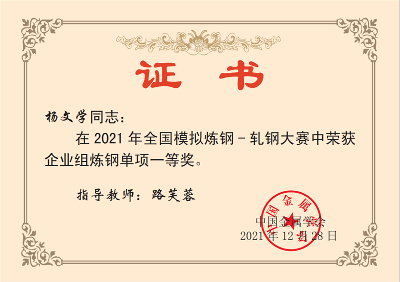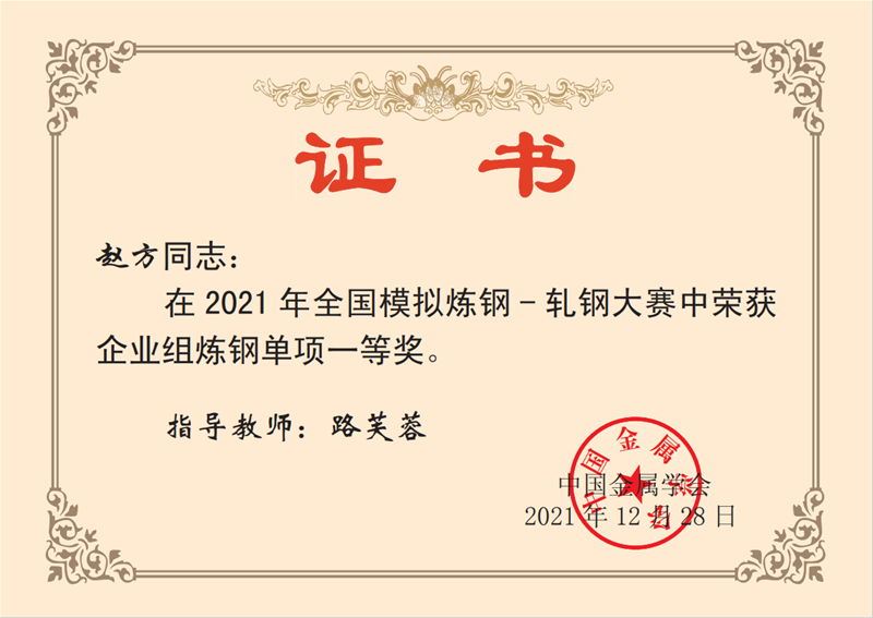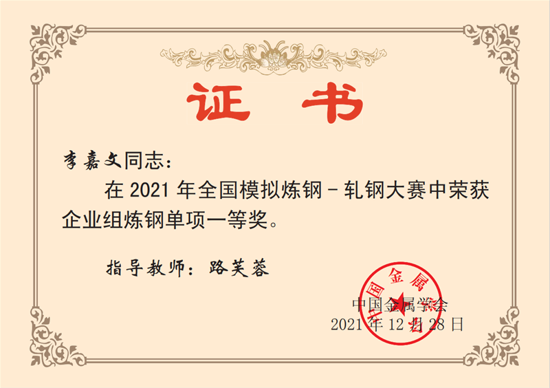 近日,從中國金屬學(xué)會傳來喜訊,公司煉鋼廠轉(zhuǎn)二作業(yè)區(qū)技術(shù)主管楊文學(xué)、煉鋼廠3#轉(zhuǎn)爐煉鋼工趙方、煉鋼廠5#轉(zhuǎn)爐煉鋼工李嘉文3名同志在2021年全國模擬煉鋼-軋鋼大賽中均榮獲企業(yè)組煉鋼單項(xiàng)一等獎。