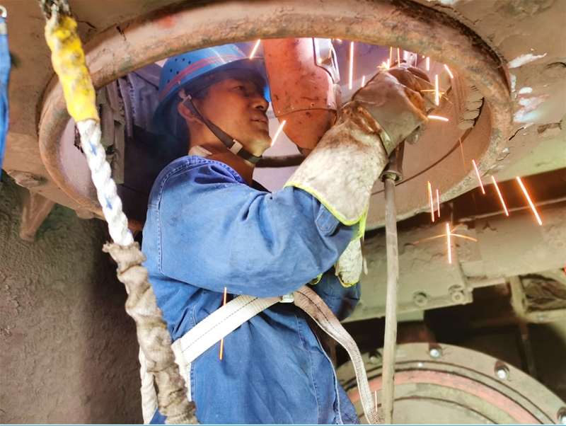 在現(xiàn)場,鉗工劉建軍綁好安全帶,快速進入到不足四平方米的閥箱開始受限空間作業(yè)。他認真查看著料斗的每一處刷槽現(xiàn)象,接過精細制作的10公分六棱鋼,一點一點將六棱鋼卡槽焊接牢固。一根、兩根、三根……伴隨著六棱鋼越來越多,劉建軍頭上的汗水不斷涌出,流進眼睛里。只見他用袖口簡單抹了一把汗,又接著檢查沖刷口……一干就是20多分鐘。