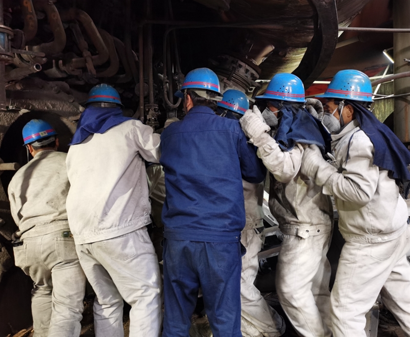12日早晨9點鐘,高爐風(fēng)口平臺上,溫度滾燙,但這絲毫不能阻擋參檢爐前工們奮進的步伐。他們身著白色阻燃服,在熱浪拂面的14#風(fēng)口旁兩兩一組,精誠團結(jié)、合力攻堅,一人雙手緊握鋼釬,一人使出全身力氣揮舞鐵錘,正全神貫注清理風(fēng)口套里面的殘渣……