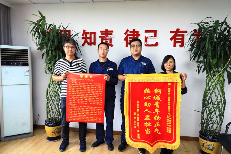 8月15日,西安中勘工程有限公司卜師傅專程趕到龍鋼公司,送來一面寫有“鋼城青年揚(yáng)正氣 熱心助人顯擔(dān)當(dāng)”的錦旗和一封感謝信,表達(dá)對(duì)公司兩名員工張繼晨、李志遠(yuǎn)幫助自己挽回經(jīng)濟(jì)損失的感激之情。