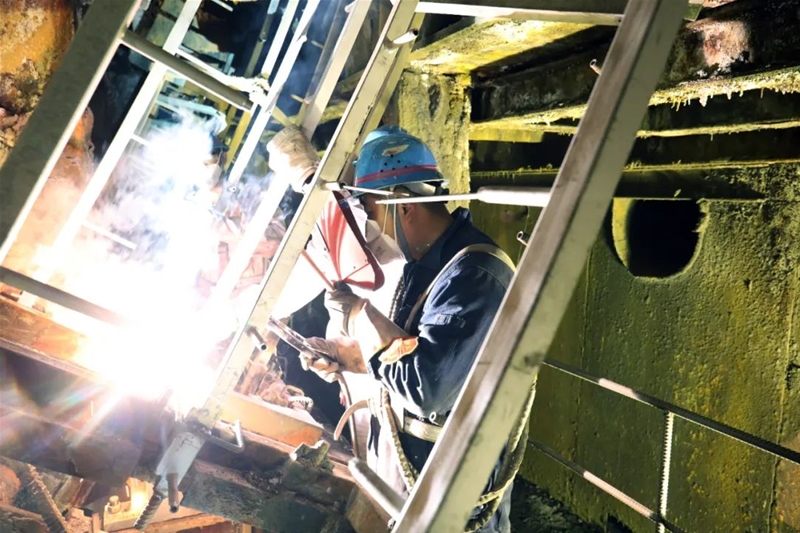 檢修現(xiàn)場 緊張有序 忙而不亂一個個忙碌的身影穿梭在各個角落他們在狹小的空間里拆卸裝置打磨焊接安裝設備璀璨的鋼花和叮叮咚咚的敲打聲熱鬧非凡