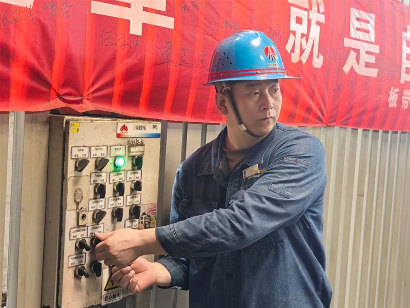 上午8:10,激烈而緊張的換輥“競賽”正式開始,只見“參賽者”的身影穿梭在現(xiàn)場,仿佛4×100游泳接力賽場上你追我趕的運動員。軋鋼工緊密協(xié)作,動作嫻熟,每一個步驟都精準(zhǔn)無誤。王煜和范宇坤負(fù)責(zé)拆卸舊輥,并配合天車工將需要更換的軋輥慢慢從軋機(jī)中抽出來,放置在下線軋輥指定地點。李陽和楊延博配合默契,負(fù)責(zé)吊運新輥以及安裝調(diào)試工作,只見一人負(fù)責(zé)操作箱操作,一人根據(jù)其指示小心翼翼地操作按鈕,調(diào)試后再仔細(xì)檢查,確保導(dǎo)衛(wèi)和除塵水管完好無損。精軋班長蓋俊生則負(fù)責(zé)檢查換輥質(zhì)量,整個過程每一個人都恪盡職守、全力以赴,每一個環(huán)節(jié)都如同接力賽中的一棒,傳遞著責(zé)任與使命。