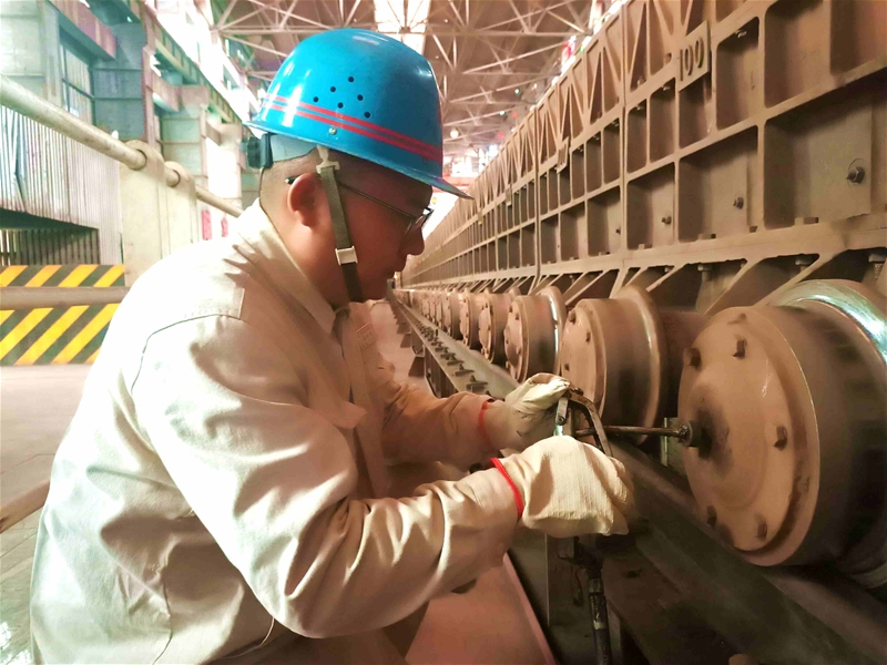 臺車軌道旁,臺車工薛峰虎正在對臺車滾輪區(qū)域設(shè)備進(jìn)行潤滑保養(yǎng),129個(gè)臺車見證了他日復(fù)一日的堅(jiān)守,50℃的高溫環(huán)境“烤”驗(yàn)著他,擺動(dòng)帶、寬皮帶、燒結(jié)機(jī)、臺車小格……見證了他矢志不渝奮斗的青春足跡。