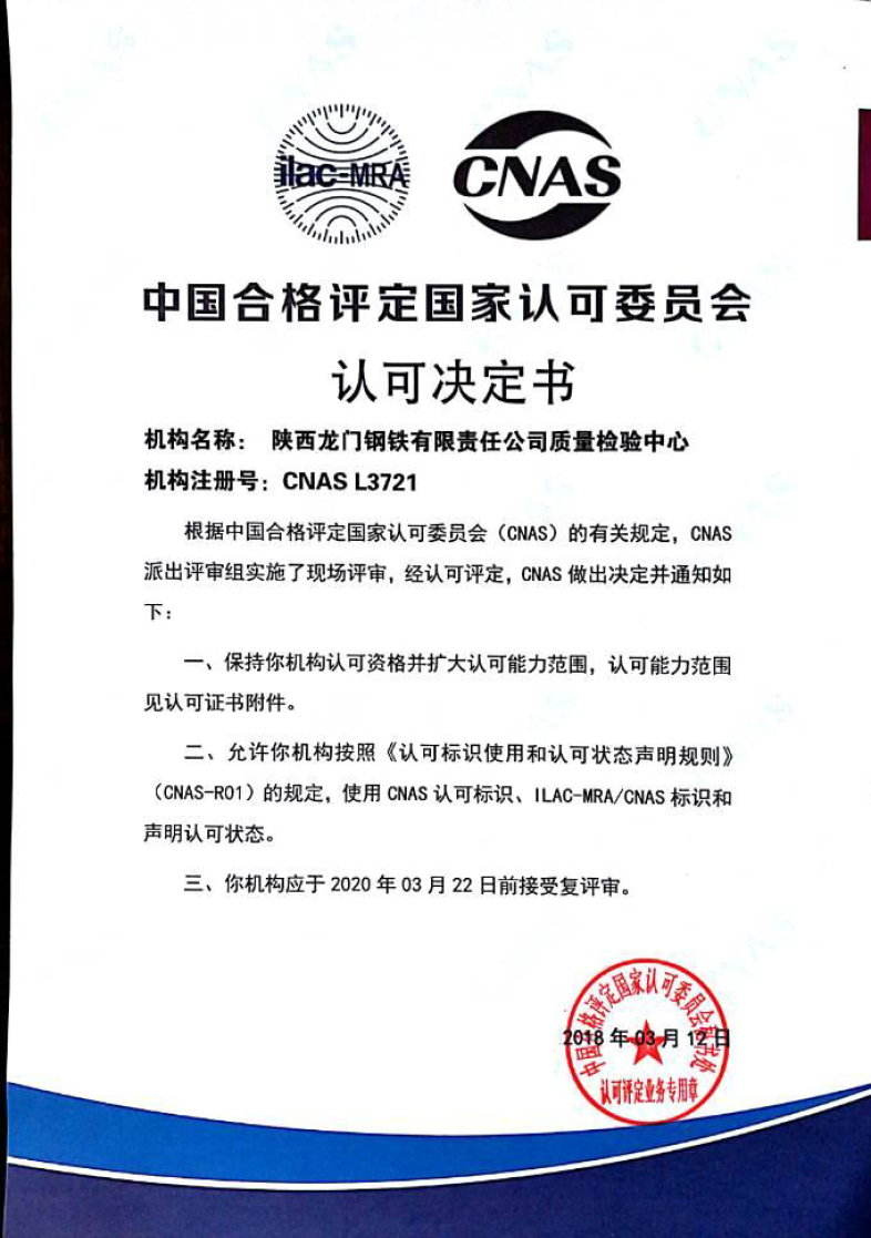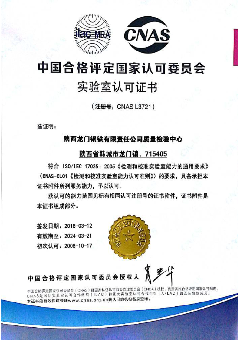 龍鋼公司能源檢計量中心質量檢驗中心擁有進口X-熒光儀、真空直讀光譜儀、紅外碳硫儀、全自動工業(yè)分析儀、熱反應測定儀、煤質巖相儀、電液伺服萬能試驗機、鋼筋彎曲和反彎試驗機、維氏硬度計、金相顯微鏡、掃描電鏡、氧氮氫儀等質量控制檢驗檢測設備,整體裝備水平處于國內領先地位。2008年,公司質量檢驗中心獲得國家實驗室認可證書,并連年通過國家認可審核及標準能力檢測驗證。