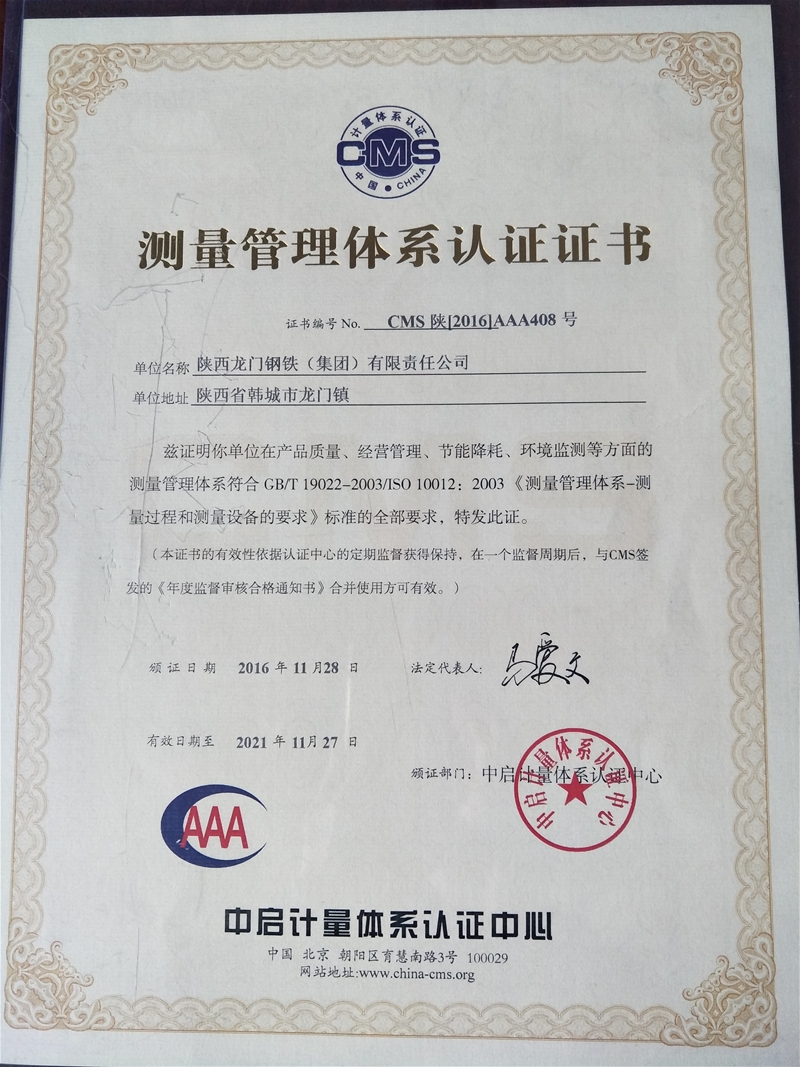 龍鋼公司于2002年初建立了計量檢測體系,2007年依據(jù)ISO10012-2003標準進一步修改和完善公司計量檢測體系,增加了測量過程控制要求,建立了測量管理體系,并于2007年12月首次通過中啟計量認證的現(xiàn)場審核,取得“AAA”級測量管理體系認證證書。累年來,通過測量管理體系的有效運行和監(jiān)督審核工作的認真開展實施,公司測量管理體系得到了不斷改進和完善,在企業(yè)的工藝監(jiān)測、質(zhì)量控制、成本管理、環(huán)境監(jiān)測方面發(fā)揮著不可替代的計量保證作用。