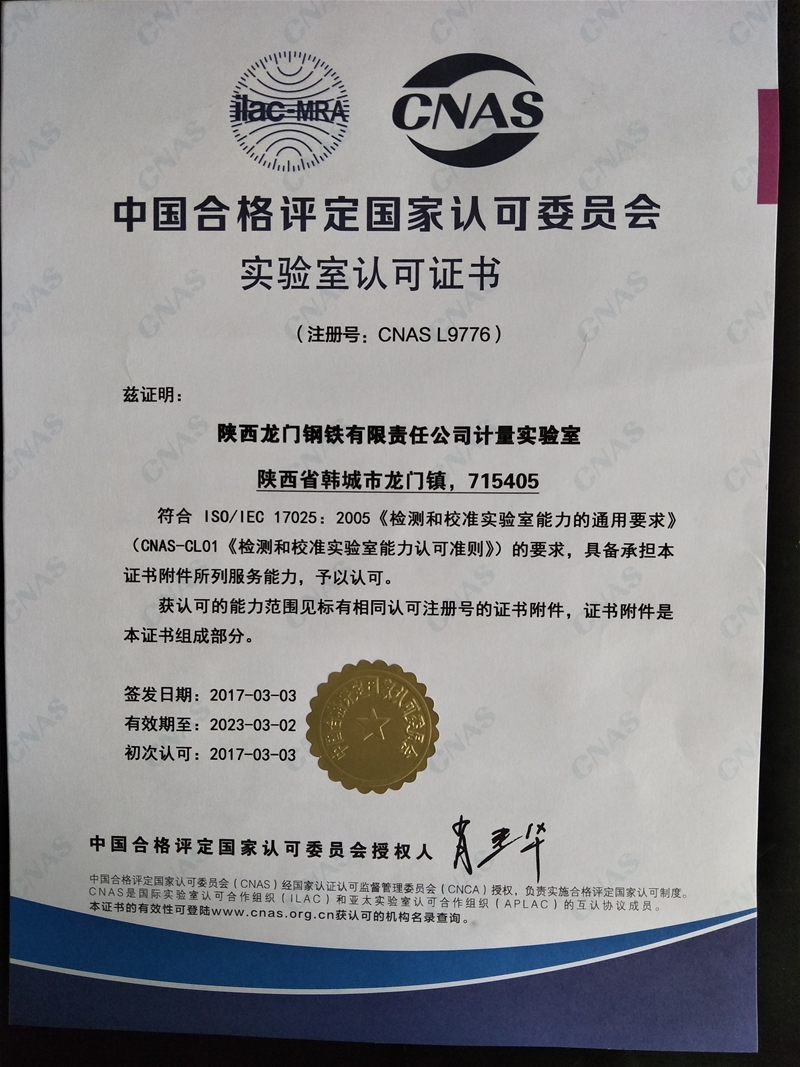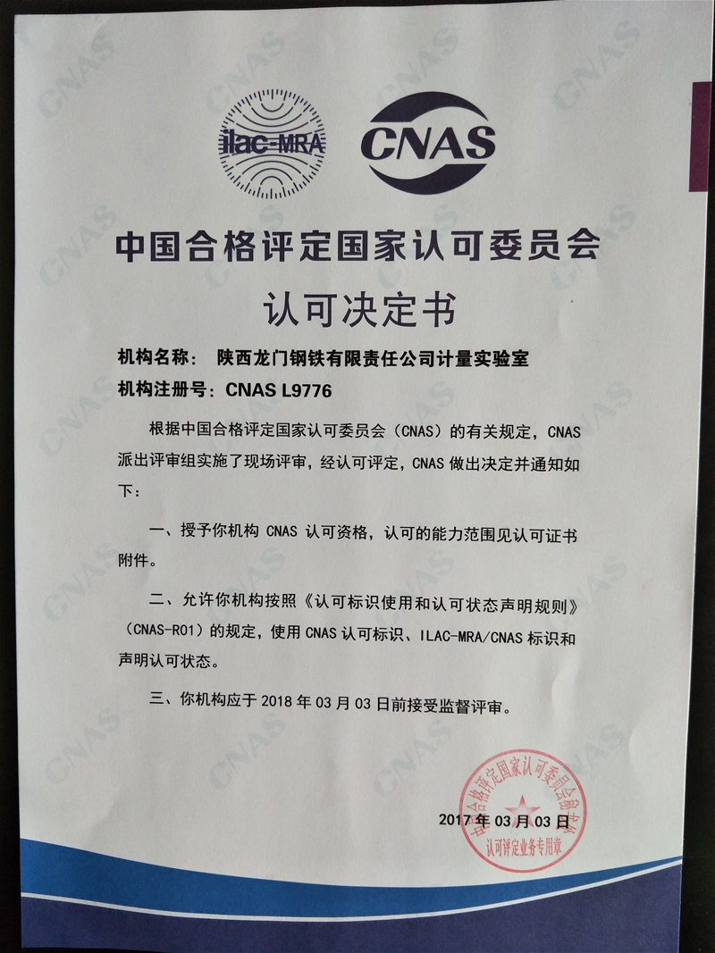 陜西龍門鋼鐵有限責任公司計量實驗室具有25年測量設備校檢歷史,具有公司力學、熱工、長度、電磁、理化五大類18項最高計量標準, 208臺(套)計量標準器具,實驗室具有獨立校檢面積360平方米,下設熱工檢定室、壓力檢定室、高溫檢定室、長度檢定室、容器檢定室、電磁檢定室、氣體檢定室、質(zhì)量檢定室等多個專業(yè)檢定室,具有年校檢測量儀器設備2萬臺的能力.