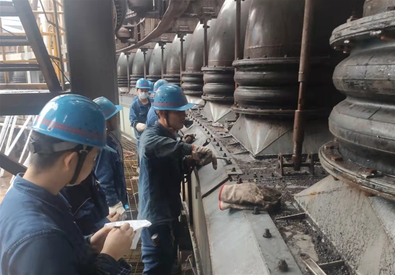 圖二:高爐崗位職工在對(duì)爐頂?shù)臍饷芟?、儀表儀器等關(guān)鍵生產(chǎn)設(shè)備進(jìn)行檢查,做好精密儀器的防潮、防雨工作,確保生產(chǎn)系統(tǒng)穩(wěn)定順行。