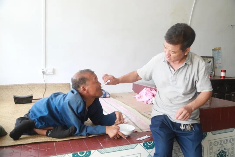 他的哥哥打小患有小兒麻痹癥,只能坐在自制小輪車上活動(dòng)。自懂事起,同邦棟就為哥哥端吃端喝、洗臉擦身。2006年,父親病重,彌留之際囑托他,不管遇到什么困難,一定要照顧好哥哥。然而,在這個(gè)家最需要照顧的時(shí)候,同邦棟的妻子卻因承受不了如此重?fù)?dān),留下孩子離婚了,給這個(gè)殘破的家又一記致命打擊。從此,哥哥和年幼的孩子就成了同邦棟的全部。夏日大院沖涼,冬季暖房洗澡,哥哥的吃喝拉撒,吃穿住行,成了他的心頭牽掛,每次上班前都把幾天的飯菜、水果和生活用品準(zhǔn)備充足。2015年哥哥尿結(jié)石住院,他緊緊巴巴湊出3000元住院費(fèi),三天三夜,寸步不離。為了自己不在家哥哥能更好生活,他自己琢磨,從廢品收購站找來舊轱轆、電瓶,找到電焊鋪?zhàn)?,為哥哥焊制了一輛自制的電動(dòng)輪椅車。一次寒冬夜里,哥哥差點(diǎn)被鎖在門外,為此,他省吃儉用,為哥哥蓋了一間帶電動(dòng)門的門房,方便進(jìn)出。日復(fù)一日、年復(fù)一年,這一堅(jiān)持就是近40余載。