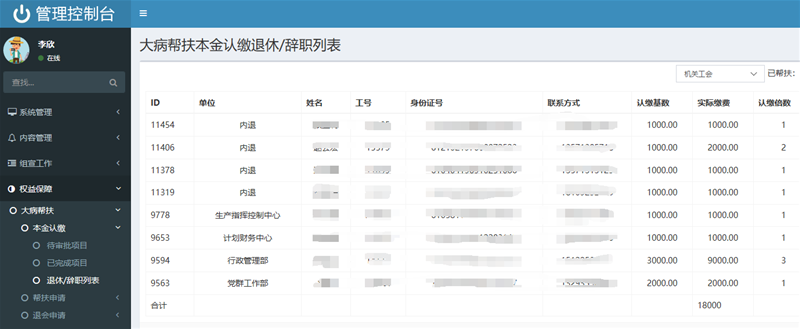職工大病醫(yī)療幫扶工作是一項(xiàng)長期性、重復(fù)性、持續(xù)性的工作,龍鋼公司工會充分利用智慧工會平臺,制定統(tǒng)一制式表格,在平臺上完成了入會職工花名冊的錄入工作,且以分會為單位顯示每位員工所繳納的會費(fèi)和總金額。退休、辭職員工在未享受大病幫扶金的前提下辦理退會手續(xù)時(shí),登錄智慧工會平臺進(jìn)行申請,經(jīng)逐級網(wǎng)上審核、審批后,申請人員名單和信息將由大病幫扶花名冊自動轉(zhuǎn)入退休或辭職人員名單列表,實(shí)現(xiàn)了分類匯總,并顯示退會人員花名冊臺賬、退會時(shí)間、人次和總金額等信息。