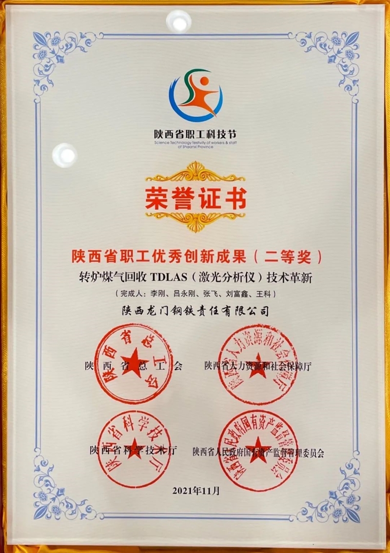 李剛、呂永剛、張飛、劉富鑫、王科聯(lián)合完成的創(chuàng)新項目《轉(zhuǎn)爐煤氣回收 TDLAS(激光分析儀)技術(shù)革新》榮獲陜西省第六屆職工科技節(jié)優(yōu)秀科技創(chuàng)新成果二等獎