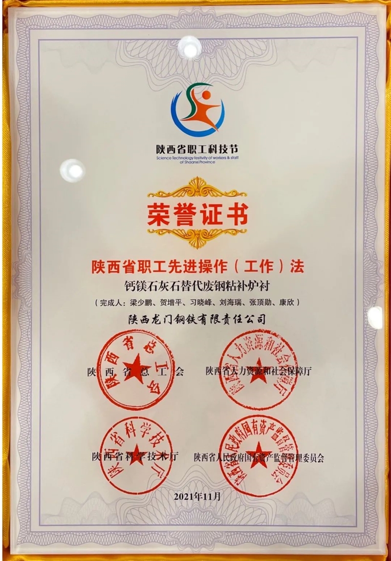 梁少鵬、賀增平、習曉峰、劉海瑞、張頂勛、康欣聯(lián)合完成的創(chuàng)新項目《鈣鎂石灰石替代廢鋼粘補爐襯》榮獲陜西省第六屆職工科技節(jié)陜西省職工先進操作(工作)法榮譽稱號。