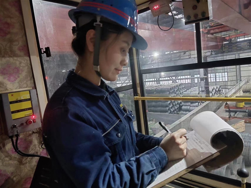 2019年9月,作為新入職大學(xué)生的她加入軋鋼廠天車工這個大家庭。身為學(xué)徒,在看到師傅第一時間處理軋線飛鋼的從容時,她便在心里默默立下目標(biāo):“我要抓緊時間努力練習(xí),爭取早日出師,做獨當(dāng)一面的員工。”于是,在后來的學(xué)習(xí)中,她盡可能地抓住每一次可以練習(xí)穩(wěn)鉤、開車的機會,買飯的路上風(fēng)馳電掣,打掃衛(wèi)生馬不解鞍。為減少如廁次數(shù),她盡量少喝水,有時甚至幾個小時都不喝水。在崗的時間被她合理安排,下班之后她仍然堅持學(xué)習(xí),穩(wěn)扎穩(wěn)打的基本功在她的爭分奪秒中迅速得到提升。帶著進(jìn)廠時的初心,她成為同一批學(xué)徒中最早出師的女天車工。