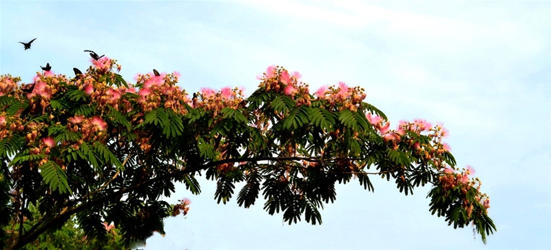 我從沒(méi)見(jiàn)過(guò)這種樹(shù),如羽毛一般的葉片和粉色的團(tuán)花真是漂亮極了。姥姥告訴我說(shuō),這是絨線樹(shù),花能入藥、泡茶,每年從六月開(kāi)始開(kāi)花,能開(kāi)到七月底,已長(zhǎng)了十來(lái)年了。小小的我,站在樹(shù)下,覺(jué)的這樹(shù)特別高大,那如巨傘一般的樹(shù)冠給我們帶來(lái)了很大一片蔭涼,尤其是每到夏天,那一頭粉色的絨線花,溢彩流霞、迷蒙飄渺,真是美極了。還有那獨(dú)特的、清香的味道能飄出很遠(yuǎn),清爽的、甜美的,吸一口,不由的會(huì)使人瞇起眼睛。