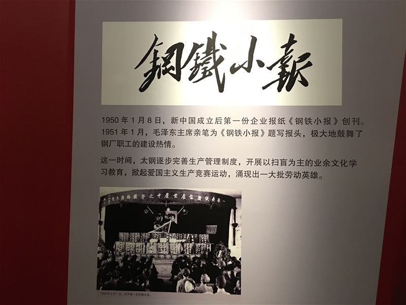 在“太鋼杯”全國冶金美術書法展覽上,得以觀賞來自四十余家冶金單位職工創(chuàng)作的油畫、國畫、版畫、真草行篆各類作品,讓人真切享受到一道文藝精神大餐。在太鋼廠史展覽館,代表們進入了一場八十四年的時光之旅。仿制的青磚灰瓦的西北鋼鐵廠大門,孫中山、閻錫山先生的黑白影像,瞬間將人拉回到實業(yè)興華、產(chǎn)業(yè)報國的上世紀初。毛澤東曾為全國第一份企業(yè)報紙,即太鋼《鋼鐵小報》題寫報名,令人對太鋼新聞事業(yè)的歷史心生幾分羨慕。館內的珠港澳大橋、軍艦、坦克、神舟三號、圓珠筆芯頭、手撕鋼等等元素,讓人更加驚嘆于太鋼產(chǎn)品在科技上的先進實力。