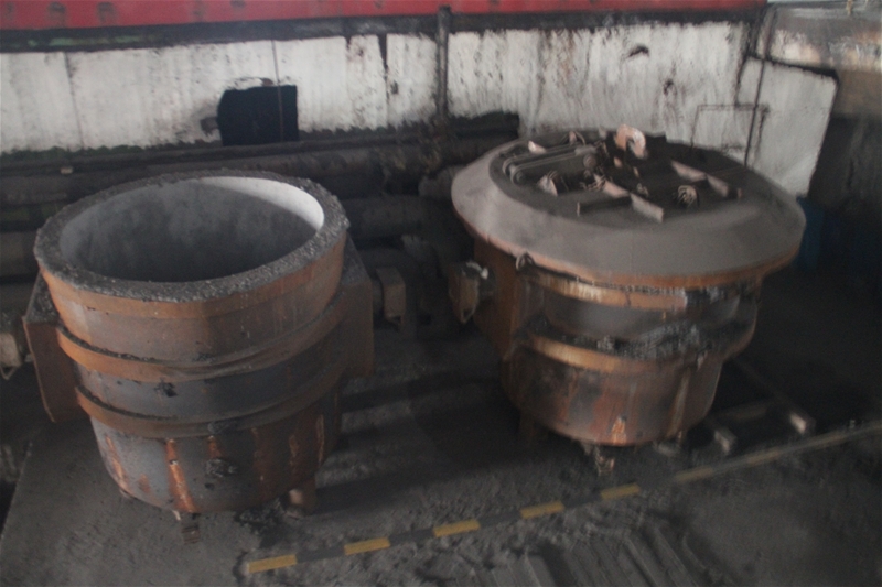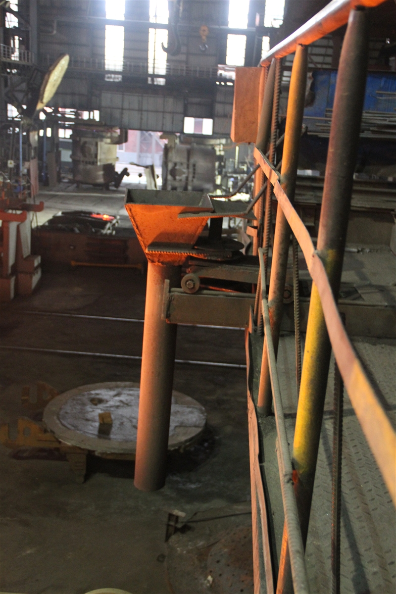 本發(fā)明提出一種新式的灌砂裝置,它可以滿足大包全程加蓋后的灌砂作業(yè),具有操作簡(jiǎn)單、維護(hù)量少、無故障率、定位準(zhǔn)確,通過在鋼包出鋼前運(yùn)行線路上方制作一個(gè)軌道、移動(dòng)小車及旋轉(zhuǎn)軸,小車上焊接一個(gè)專用灌砂斗和¢150mm的鋼管,鋼管垂直對(duì)準(zhǔn)水口,當(dāng)鋼包運(yùn)行到區(qū)域范圍內(nèi),人推小車在軌道上帶動(dòng)灌砂斗調(diào)整縱向灌砂位置,縱向到位后,旋轉(zhuǎn)灌砂斗微調(diào)橫向位置,達(dá)到準(zhǔn)確對(duì)中后,進(jìn)行灌砂作業(yè)。
