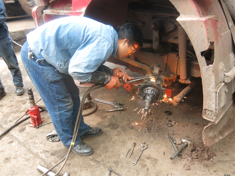 項(xiàng)目簡(jiǎn)介:翻斗車(chē)拋灑槽翻轉(zhuǎn)軸使用φ16mm圓鋼與6分鋼管組成。由于汽車(chē)大箱升起頻繁,且圓鋼強(qiáng)度不夠,圓鋼很容易變形。致使翻轉(zhuǎn)不靈活,造成拋灑槽變形,且槽內(nèi)物料常有存料,造成沿路拋灑。為了增加圓鋼強(qiáng)度,改用廢舊汽車(chē)鋼板卡子,加工成翻轉(zhuǎn)軸后,固定在大箱底部并與套有一定配合間隙,這樣既能增強(qiáng)了軸的強(qiáng)度,又使拋灑槽翻轉(zhuǎn)更靈活。不僅降低了費(fèi)用,每臺(tái)車(chē)可節(jié)約φ16圓鋼1米、減輕了員工的勞動(dòng)強(qiáng)度、解決了拋灑槽翻轉(zhuǎn)不靈,易變性的問(wèn)題而且