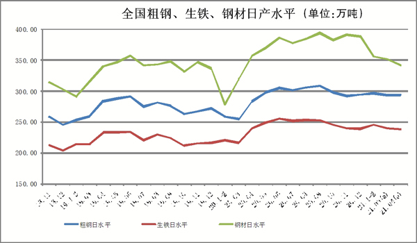 根據(jù)重點(diǎn)統(tǒng)計(jì)鋼鐵企業(yè)產(chǎn)量估算,本旬全國共生產(chǎn)粗鋼2933.68萬噸,日產(chǎn)粗鋼293.37萬噸、環(huán)比增長1.14%、同比增長12.60%;生產(chǎn)生鐵2386.64萬噸,日產(chǎn)生鐵238.66萬噸、環(huán)比增長0.70%、同比增長8.10%;生產(chǎn)鋼材3422.50萬噸,日產(chǎn)鋼材342.25萬噸、環(huán)比下降0.83%、同比增長12.73%。本月累計(jì)平均日產(chǎn),全國粗鋼環(huán)比下降0.05%、同比增長12.60%,生鐵環(huán)比下降0.36%、同比增長8.10%,鋼材環(huán)比下降2.58%、同比增長12.73%。