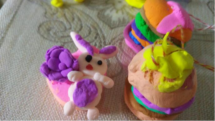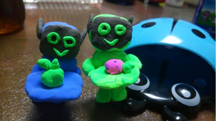 妮子的手很巧,一盒橡皮泥在她的手里像施了魔法似的千變?nèi)f化,想要什么就捏什么:有七彩虹,有美味的心形蛋糕,有漂亮的蝴蝶仙子,有吃著胡蘿卜的兔子,有躺在嬰兒車?yán)锏男雰?,有套在手指上的大花指環(huán),有掛在脖子上的漂亮吊墜,有小茶壺和小茶杯。旸程喜歡機(jī)器人,她就在手機(jī)上看了一眼,不一會(huì)功夫就捏出來了:藍(lán)色的身子,方形的頭,圓圓的眼睛,尖尖的耳朵,手里還托著個(gè)盤子,是專門送水或者送別的東西用的,竟和手機(jī)上的機(jī)器人相差無幾。旸程直夸“真不錯(cuò),真像,姐姐真棒!”再一會(huì)功夫,妮子又捏出了另一個(gè)機(jī)器人,倆人學(xué)機(jī)器人走路,學(xué)機(jī)器人對(duì)話,玩得不亦樂乎。