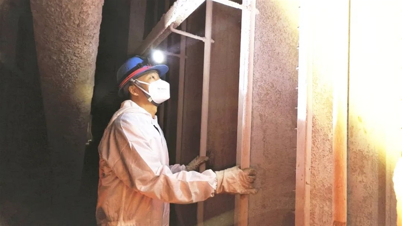 在完成通風(fēng)、氧含量和有害氣體檢測合格后,閆剛強(qiáng)“全副武裝”,對自己的勞護(hù)用品和安全工器具再一次確認(rèn),帶頭鉆進(jìn)40cm×50cm的長方形人孔門,身著密不透風(fēng)的防塵服穿梭在40℃的電場內(nèi)部。兩臺除塵器8個電場的檢查任務(wù),讓他已無暇顧及艱苦的作業(yè)環(huán)境,僅半個電場就有21排極線、22排極板、22個振打錘。每一個他都要檢查陰極線有無彎曲斷裂、陽極板有無脫槽、定位板有無脫落,振打錘有無磨損……確?;芈吠暾蛯?dǎo)線連接牢固。