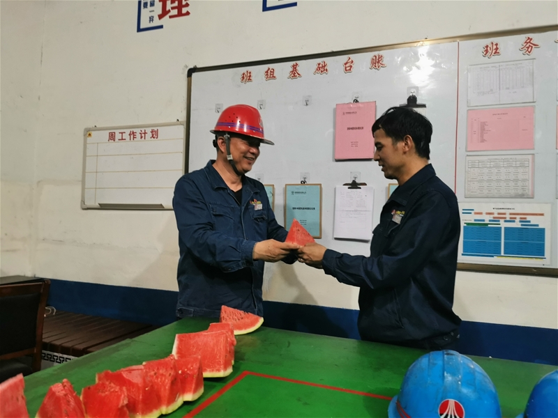 “雷師,下午1#轉(zhuǎn)爐檢修,大熱天一定要做好后勤服務(wù)工作,西瓜、飲料、綠豆湯都要準(zhǔn)備到位……”“今年的飲品種類豐富,西瓜、綠豆湯管夠,我保證為大家做好后期服務(wù)。”